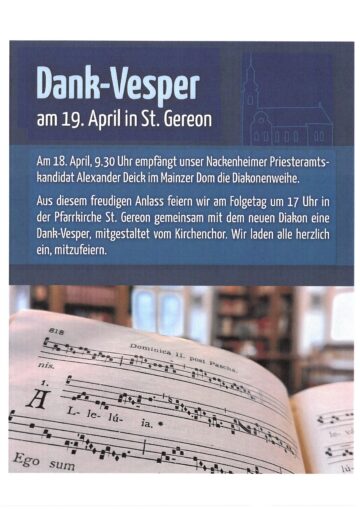 Allgemein Herzliche Einladung zu Dank Vesper schrohe@st-hildegard-loerzweiler.de Posted on 13. Apr 202609. Apr 2026